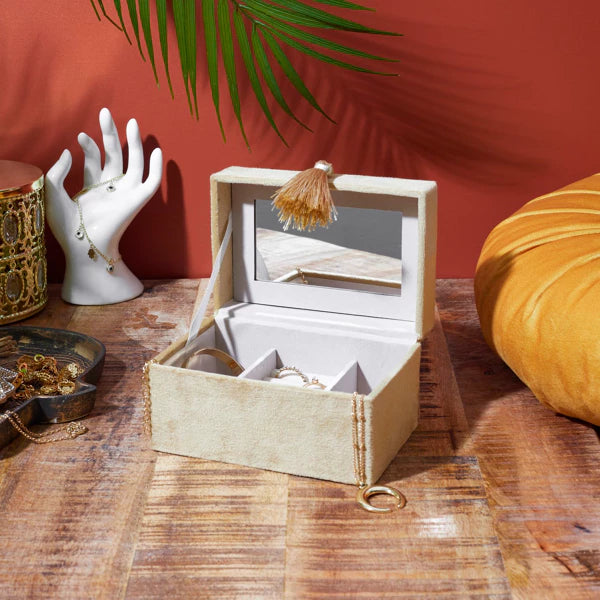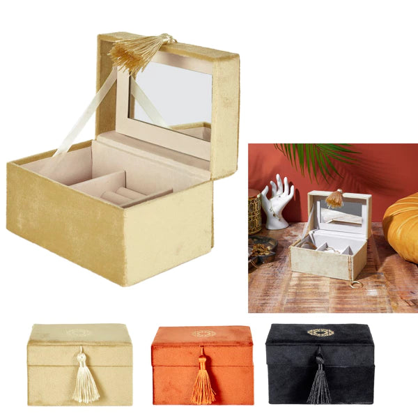 Ces boîtes luxueuses ne se contentent pas de mettre en ordre vos bijoux, elles les présentent avec une distinction sans pareil grâce à des compartiments intérieurs bien pensés et un miroir intégré pour admirer vos accessoires. Chaque boîte est finie avec un pompon chic qui ajoute une touche de sophistication. Sélectionnez la couleur qui s'aligne avec votre style personnel ou votre décor pour ajouter une touche de luxe à votre routine de beauté quotidienne.