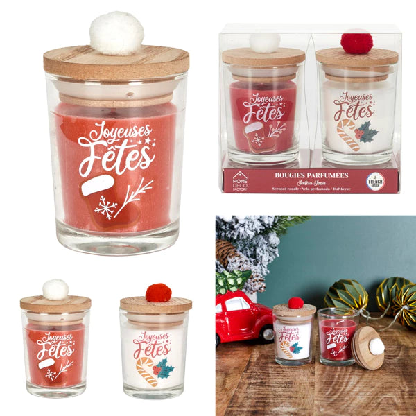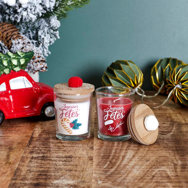 Vous aimez les bougies parfumées ? Vous allez craquer pour le charme de ce duo de bougies à pompons et couvercles en bois. Le verre est illustré de dessins et de messages 100% craquants sur le thème de Noël.
