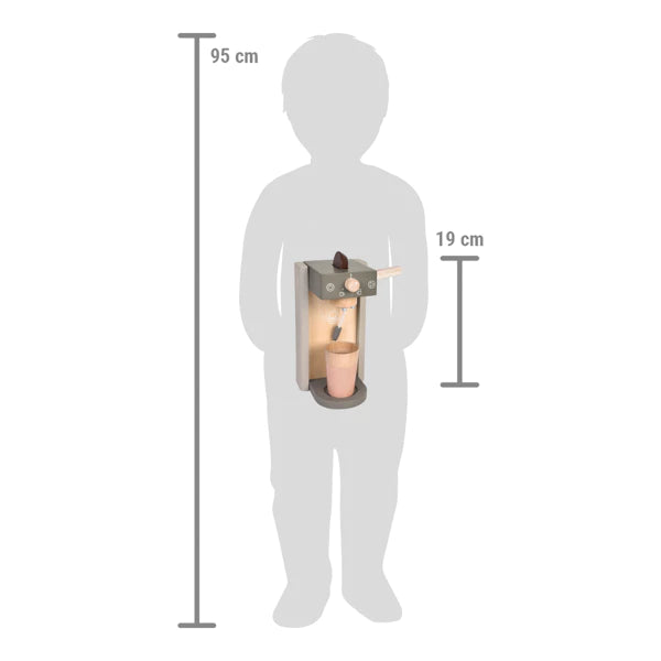 Pour le barista de la cuisine enfant ! Cet ensemble complet en bois comprend une cafetière moderne, deux jetons à café, deux tasses à café et deux bouchons à mousse de lait. Les jetons à café, qui tombent dans les tasses et sont élégamment décorés de mousse de lait magnétique, garantissent un jeu réaliste ! La subtile palette de couleurs gris chaud et bois naturel fait de cet ensemble de cuisine un véritable accroche-regard ! Un ensemble parfaitement assorti aux couleurs des cuisines enfant « savoureuses » (12216, 12672, 12673) ! La cafetière peut être équipée d'un jeton à café sur le dessus, qui tombe dans la tasse par la fente lorsque le levier est actionné. La forme conique des jetons à café garantit que le jeton tombe toujours horizontalement dans la tasse. Le « tube à mousse de lait » est un fil métallique recouvert de tissu qui peut être plié dans toutes les directions. Un bouchon à mousse de lait est fixé à son extrémité par un aimant, permettant de verser le lait sur les tasses. Son design équilibré et ses couleurs modernes s'intègrent discrètement dans une ambiance enfantine et un salon moderne.